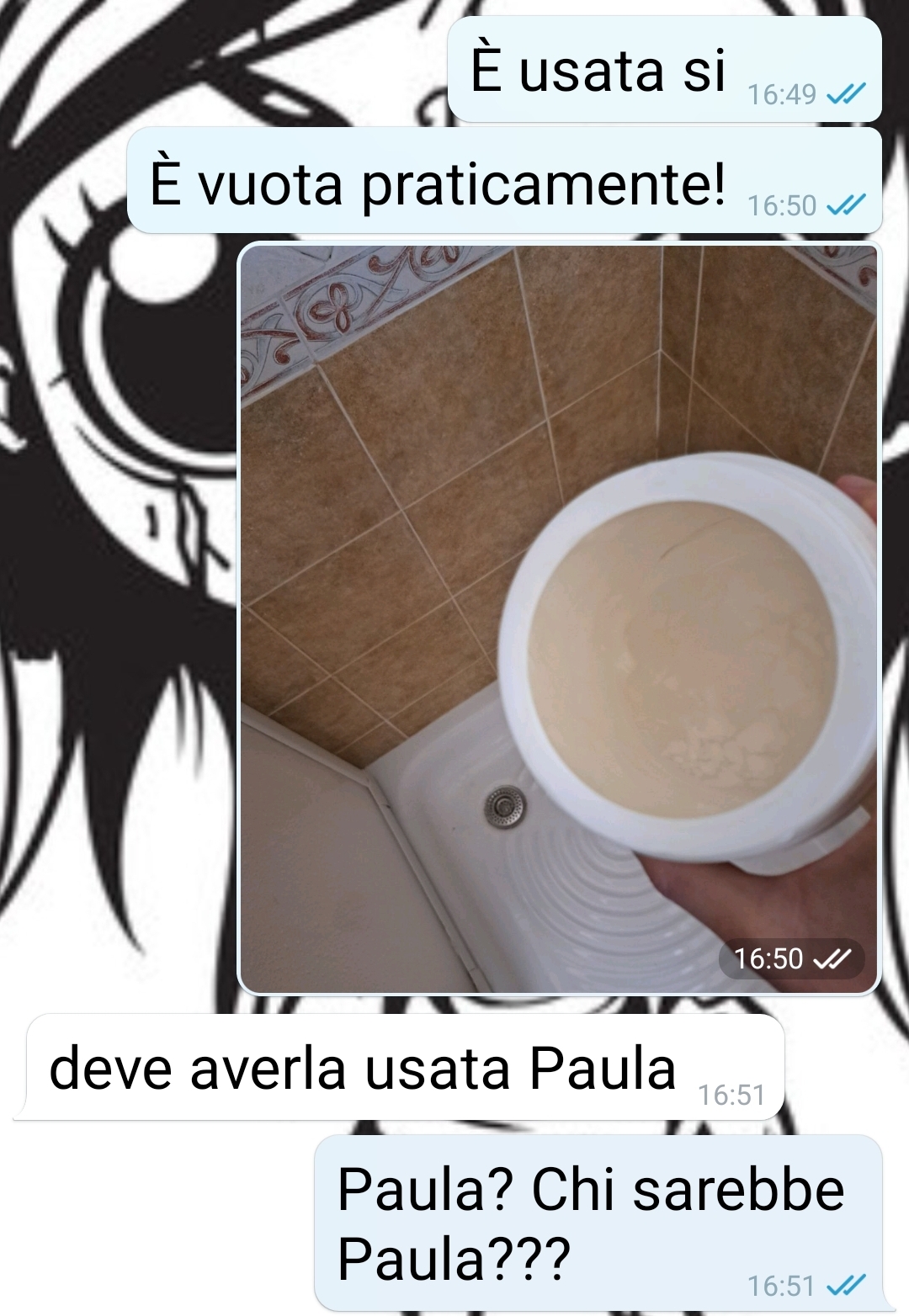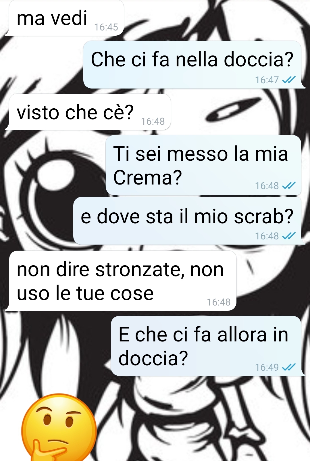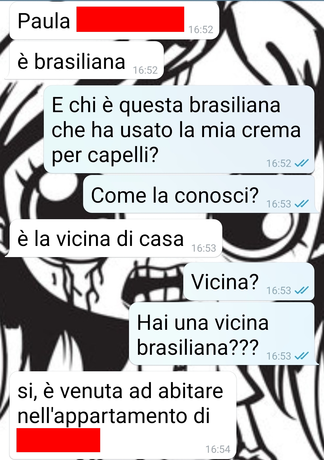 Aiutare il prossimo è una cosa bella ed edificante. E il mio fidanzato sposa questo pensiero. Se poi ad essere in difficoltà è una bella vicina brasiliana… Io veramente non so che fare. Non so come prenderla. Può darsi che sono esagerata, ma se ripenso alla chat con il mio fidanzato, e la rileggo, il sangue mi arriva al cervello. Lui sta in un’altra città in una casa in affitto, da solo, e io quando posso, più o meno ogni 2 settimane, lo raggiungo per stare un week end lungo insieme. Quindi ho portato un bel po’ di cose mie in casa che per comodità lascio sempre. Oggi arrivo, pranziamo assieme, lui va a fare il turno pomeridiano e io a farmi una doccia. Ma la mia crema per capelli e il mio scrab non sono dove devono essere. E lui candidamente mi dice che la vicina deve averli usati. La vicina brasiliana! Che si fa tranquillamente la doccia a casa sua! Solo a me la cosa da fastidio? Donne ho ragione sono pazza??? Considerando quello che ho scoperto alla fine… Vabbè giudicate voi