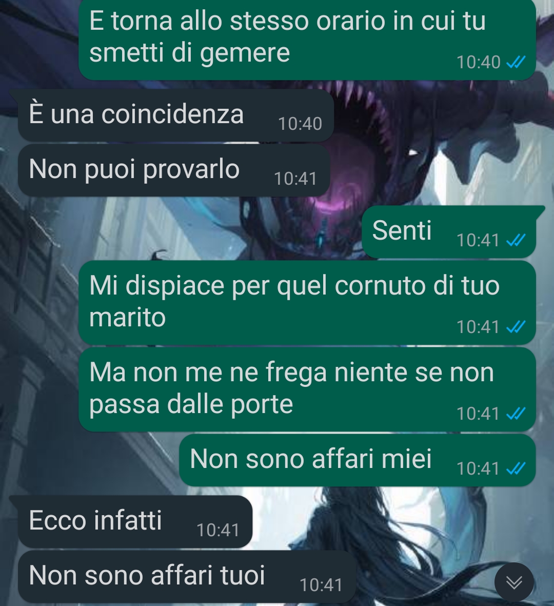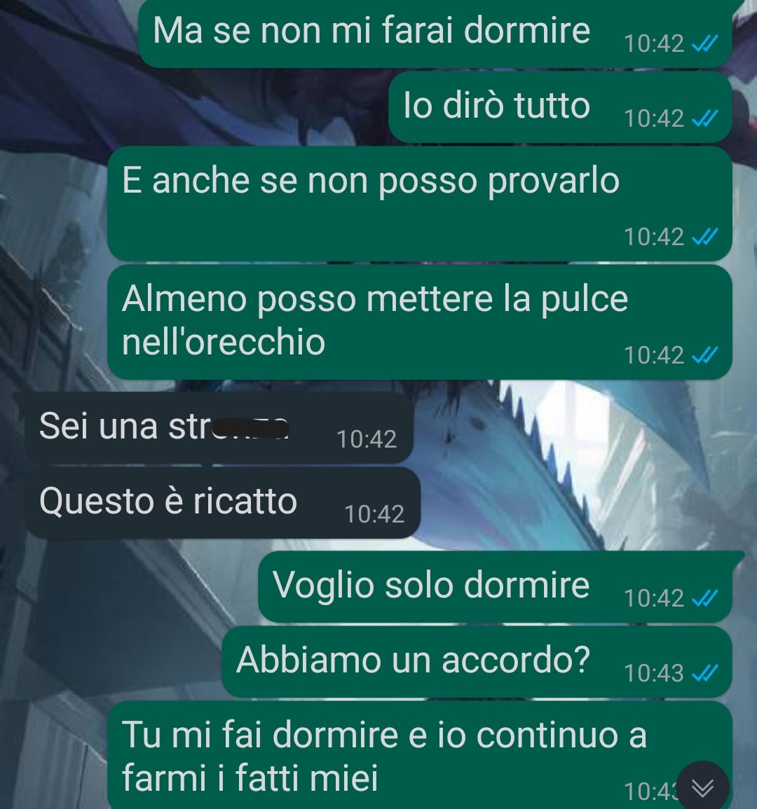 Carla, che ha 31 anni e vive da sola in un appartamento, ha avuto dei contrasti con la vicina del piano di sopra, una sua coetanea. Questa donna si è distinta per comportamenti poco rispettosi, come lasciare l’auto davanti al parcheggio o buttare la spazzatura dal balcone. Il marito della vicina, descritto come una persona mite, lavora come portiere notturno o svolge un lavoro simile. Negli ultimi tempi, però, la vicina ha iniziato a fare qualcosa di insolito durante la notte, disturbando il sonno di Carla e creando un ambiente invivibile. Dopo aver tentato invano di risolvere il problema per vie legali e convenzionali, la nostra amica ha deciso di ricorrere a una soluzione più drastica.