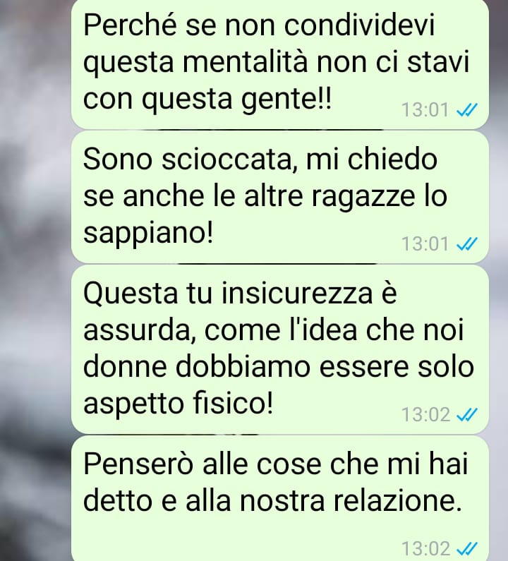 Le parole ricevute dal suo compagno l’hanno colpita in modo particolare, non solo per il contenuto, ma per il tono e per i giudizi espressi. Un comportamento che, a suo avviso, risulta totalmente inaccettabile nel contesto di una relazione sana e, come lei stessa scrive, “nel nuovo millennio”. La nostra fan ha deciso di raccontare tutto questo non per suscitare pietà, ma per mostrare quanto certi atteggiamenti possano lasciare ferite profonde. La chat che segue parla da sola e lascia emergere in modo chiaro quanto accaduto.