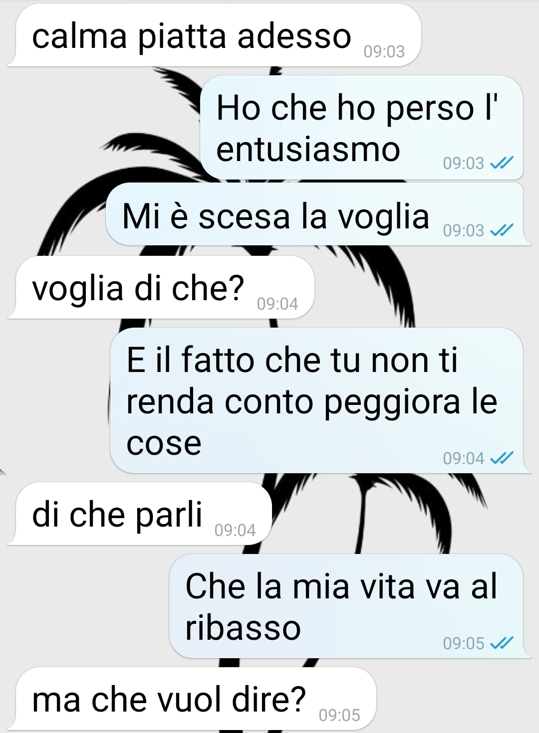 Mio marito mi dà da pensare, per come si comporta, per come soffoca ogni mia aspirazione senza forse rendersene del tutto conto. Ciao Commenti Memorabili, voglio che chi segue la pagina legga questa chat tra me e mio marito, per sapere cosa ne pensa la massa, un osservatore esterno. Avere un parere che sia distaccato. Con Mario siamo sposati da 4 anni, dopo 4 di fidanzamento. Ci amiamo e stiamo bene, quelle che sono le cose importanti della vita ci vedono uniti e solidali (quasi tutto… e fino ad ora…). Ma lui dal matrimonio ha avuto sempre un modo di fare diverso. Non so se sia sempre stato così o adesso si esprime senza filtri, ma sta di fatto che ogni cosa che penso di fare o acquistare lui deve sempre ridimensionarla. Deve ribassare ogni mia aspettativa o desiderio. E non chiedo la luna, parlo di cose normali, dal quotidiano allo straordinario. Ma tutte cose che possiamo e che avremmo potuto permetterci. Finalmente dopo mesi ho spiattellato tutto. E mi ero quasi illusa che avesse capito.