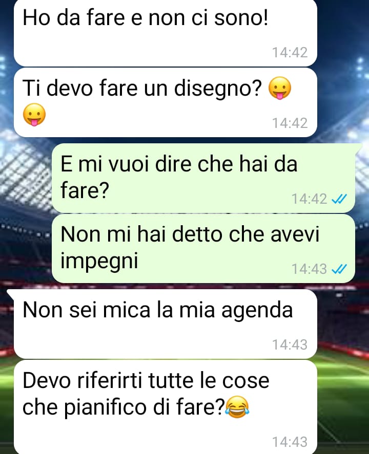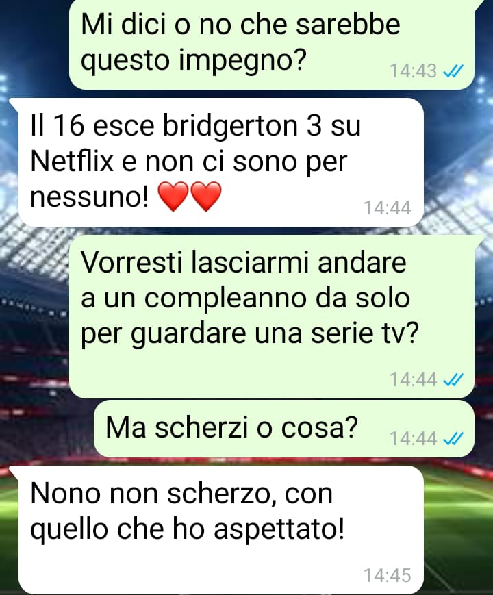 Ciao a tutti, ho mandato questa chat perché sono parecchio arrabbiato con la mia ragazza. Si discute spesso su come i maschi non rispettino abbastanza le ragazze, ma io penso che la situazione si stia capovolgendo sempre di più, soltanto che quando sono i maschi a far notare una mancanza di rispetto, le femmine vanno subito sulla difensiva. Ormai la mia morosa e io non parliamo senza litigare da 3 giorni, ovvero da quando è avvenuta questa conversazione. Certo, molto di voi diranno “alla faccia dei problemi”, ma io sono fermamente convinto che una relazione è fatta dai semplici momenti quotidiani e se c’è qualcosa ce non va con le piccole cose, allora come possono andare bene anche le cose più serie? Mi sono reso conto che la mia morosa ha un problema con la sua fissa per le serie tv e questa chat ne è la prova. La cosa assurda e che fa più ridere (per non piangere) è come si è giustificata pur di avere ragione. Stiamo veramente arrivando a un punto in cui film e finzione sono più importanti delle persone?
