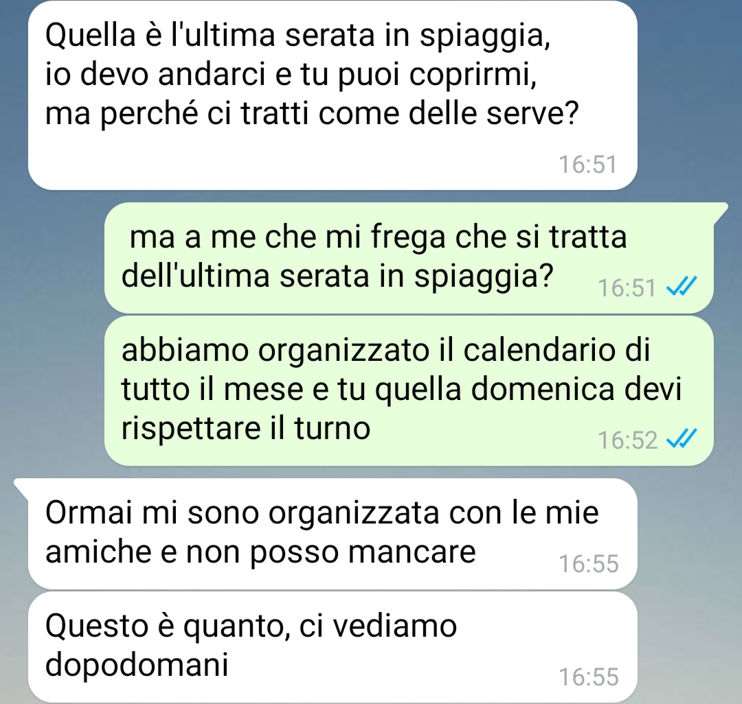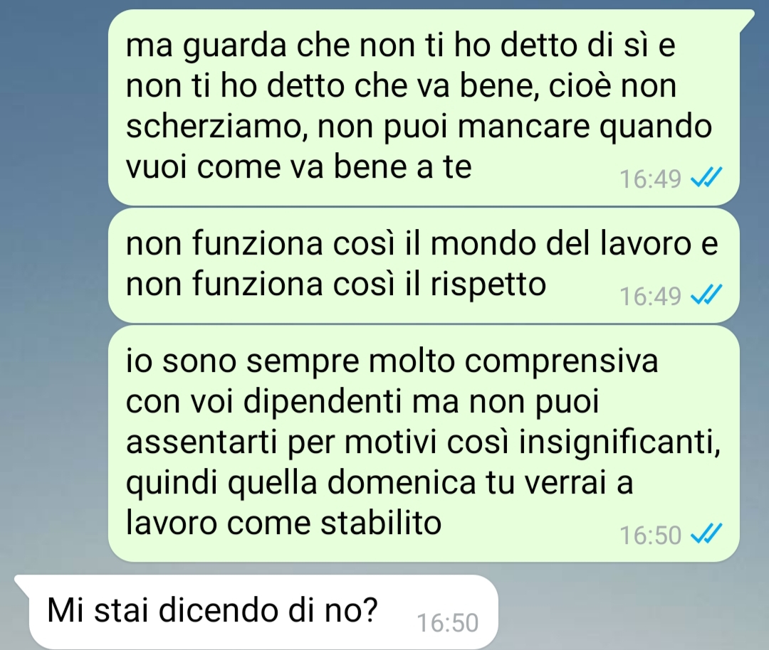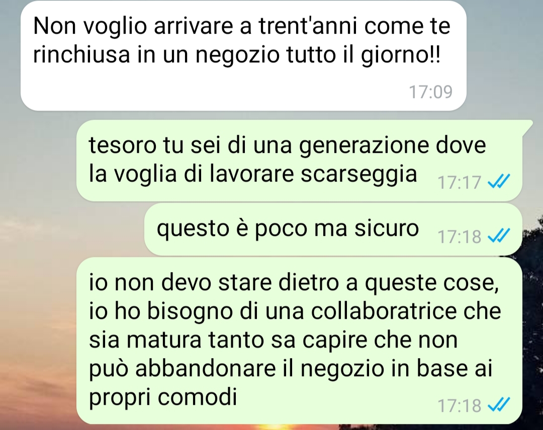 La situazione che più l’ha indignata è avvenuta pochi giorni fa, quando una delle giovani commesse impiegate nel suo negozio ha fornito una giustificazione che la nostra follower definisce “assurda” per evitare un turno di lavoro. A suo dire, si tratta dell’ennesima scusa inverosimile ricevuta nel giro di poco tempo, una tra tante, che le fanno perdere fiducia nell’affidabilità e nella serietà di alcune collaboratrici.