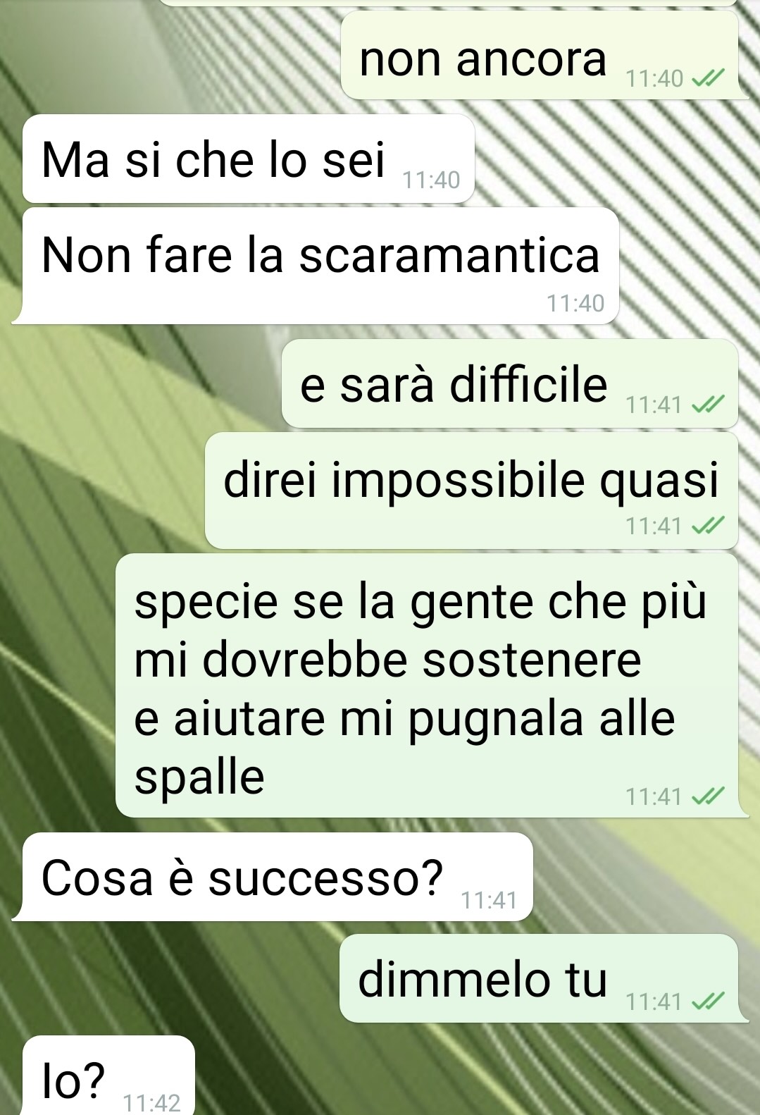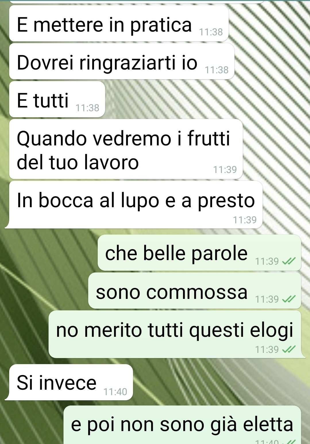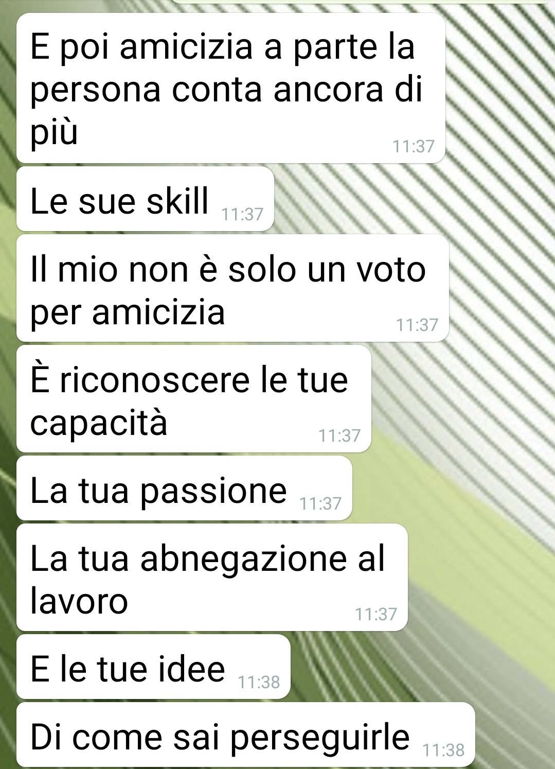 Ho voluto ringraziare la mia amica che tanto mi ha sostenuto in campagna ele4orale. Ma non sono rose e fiori… Pagina di spunte blu buongiorno a tu<, io sono DF, mi limito alle iniziali perché preferisco evitare qualsiasi pe4egolezzo, dato che vi porto una discussione a tema poliCco. Sono una persona benestante, figlia unica, e sempre mi sono spesa per la comunità dove risiedo. Ho molte amicizie (so bene che tante di queste lo sono solo per interesse…), sono molto generosa e un paio di oggi donne, ieri ragazze, e ancora prima bambine, sono (siamo) come sorelle. Con tu4o quello che ne consegue. Quest’anno dopo tanC tentennamenC ho deciso di candidarmi, per avere ancora più possibilità di aiutare la comunità. Ovviamente la mia unica sicurezza è il supporto delle persone a cui sono più cara. Ma queste votazioni (e sopra4u4o questa chat) mi hanno fa4o ricredere sulle mie convinzioni più radicate. Quella che credevo una sorella non lo è. Non è niente e mai più lo sarà, dopo quello che ha de4o. Scrivete cosa ne pensate nei commenti di Facebook e Buona lettura!