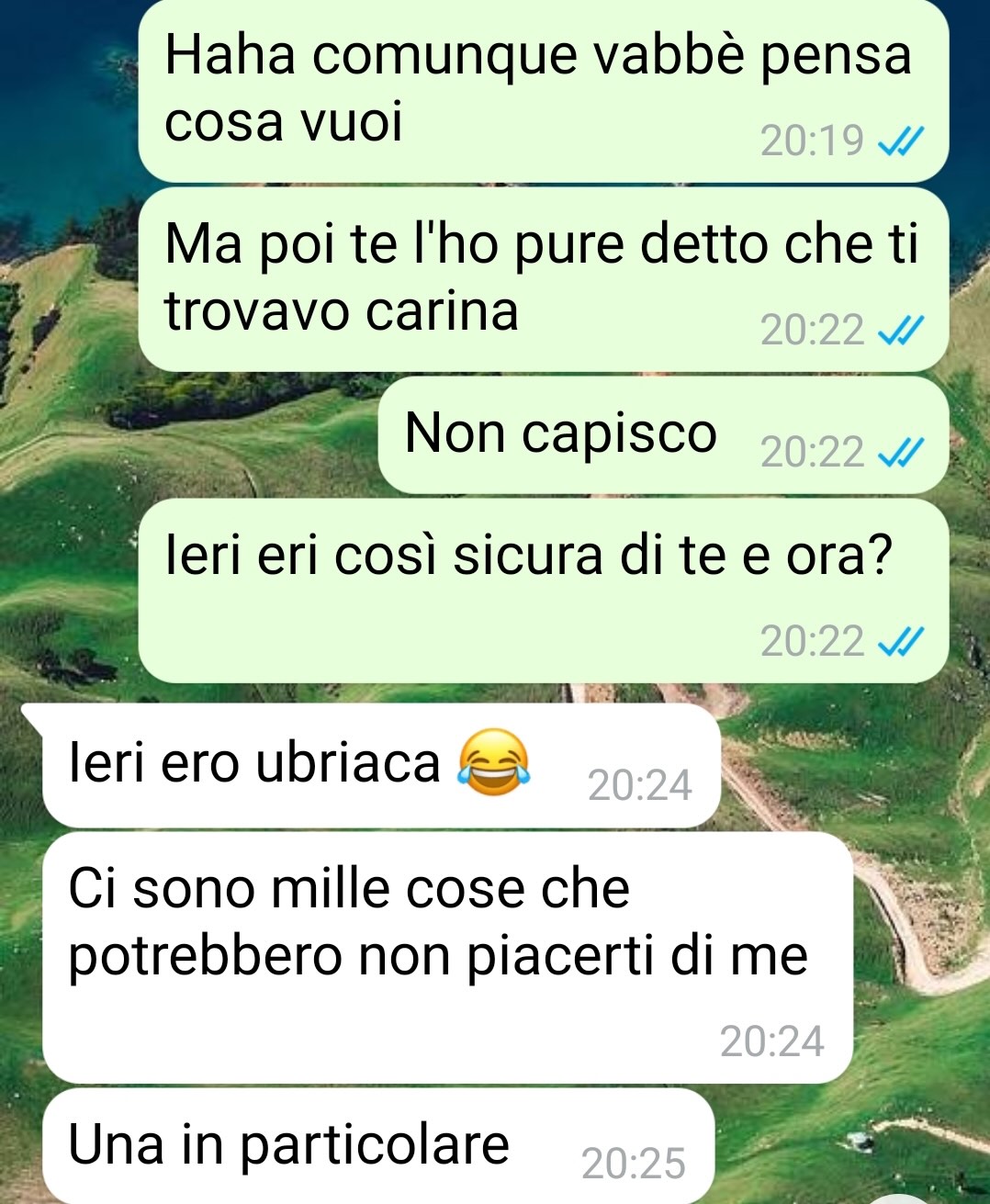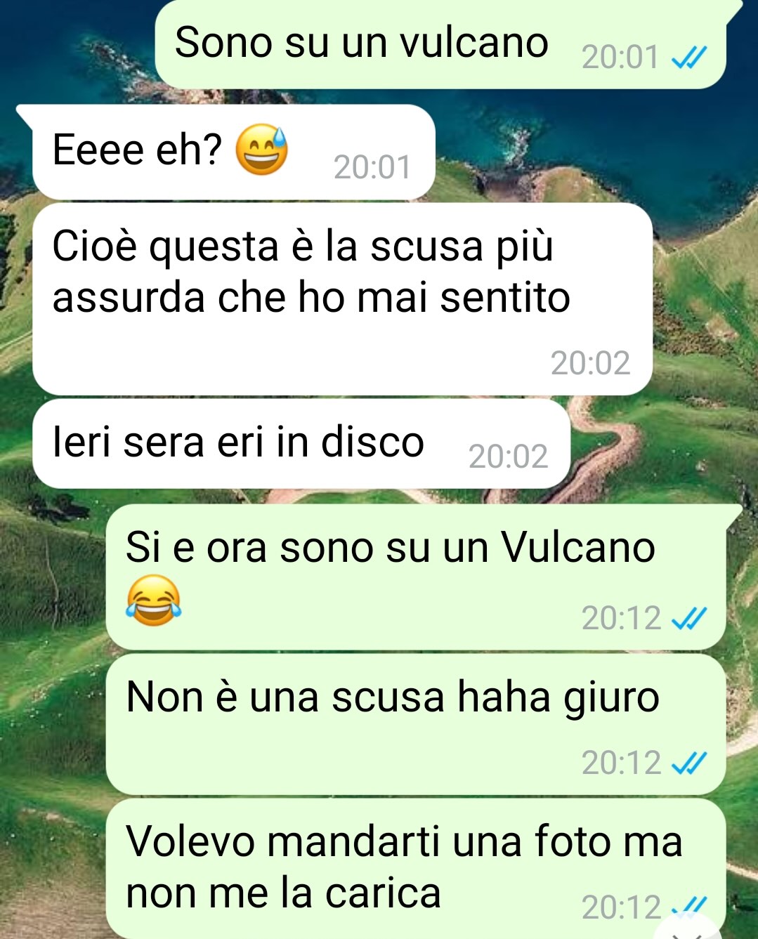 Mi chiamo Fabio e vi mando questa vecchia conversazione che ho riesumato dai meandri del telefono per dirvi: se andate in discoteca, ai giorni d’oggi, non fidatevi MAI delle tipe. Lo so che lo sapete già, ma comunque ci tengo a ricordarvelo! Vi faccio una breve intro alla faccenda. Di lavoro faccio il fotografo naturalista (fotografo paesaggi, flora, fauna dei posti) quindi vado in giro per il paese per trovare gli scatti più belli. A ottobre dell’anno scorso dovevo andare alle Isole Eolie, ma la sera prima della partenza i miei amici mi hanno trascinato in discoteca per festeggiare il compleanno di uno di loro. Qui, conosco una ragazza che però mi sembrava un po’ particolare, ma comunque molto bella. Immaginavo che il suo comportamento dovesse essere influenzato dal fatto che era un po’ alticcia, ma non le ho dato troppo peso. Ci scambiamo i numeri e non ci penso più. L’indomani parto presto al mattino praticamente in after, arrivo in Sicilia, poi vado alle Eolie e salgo su Stromboli per delle foto. Di sicuro non ho pensato al cellulare quel giorno, infatti alla sera mi arriva un messaggio della ragazza della discoteca. E il resto, il degenero, lo lascio leggere a voi.