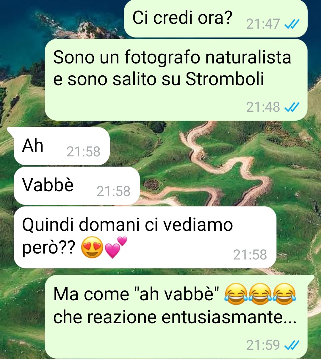 Il nostro fan Fabio ha raccontato di essere un fotografo naturalista, professione che lo porta spesso in giro per l’Italia per immortalare paesaggi, flora e fauna. Qualche tempo fa, poco prima di partire per un viaggio alle Isole Eolie, è stato convinto dagli amici a uscire in discoteca la sera prima, per festeggiare un compleanno.